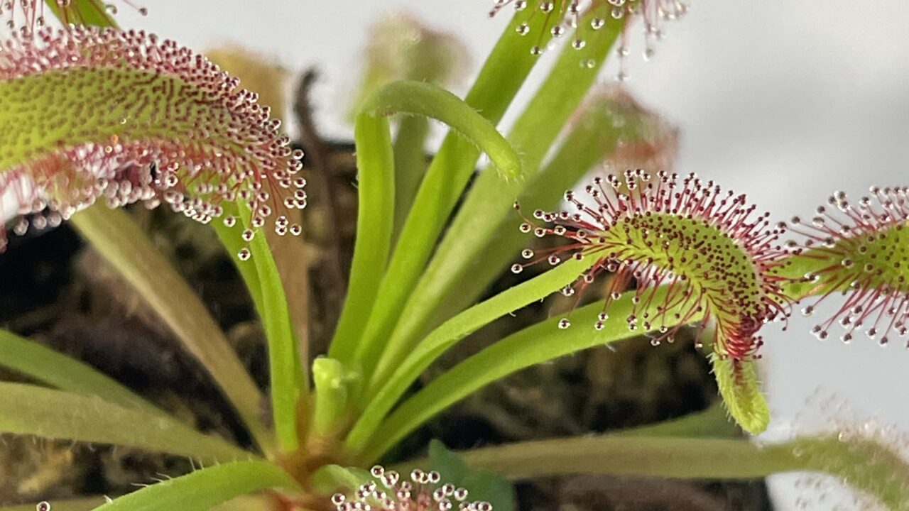 緑の葉に鮮やかな赤い毛が生え、そんな毛の先は雫のような粘液をまとった不思議な見た目です。